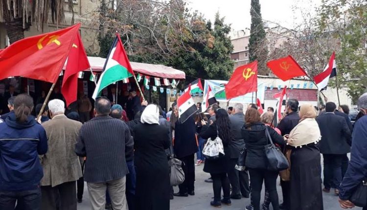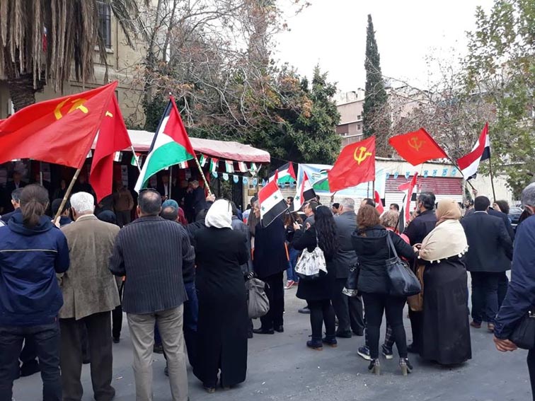 شارك وفد من اتحاد الشباب الديمقراطي السوري في الوقفة التضامنية التي نظمها الاتحاد الدولي لنقابات العمال العرب للتضامن العمالي العالمي مع الشعبين السوري في الجولان المحتل والفلسطيني ضد ممارسات الاحتلال الإسرائيلي ورفضاً لـ(صفقة القرن) التي تتبناها الإدارة الأمريكية أمام مقره في ساحة التحرير بدمشق. وقد أكد المشاركون ضرورة مواجهة المخططات الصهيونية الرامية إلى تصفية القضية الفلسطينية وسياسات التهجير والتطبيع، كما أكدوا دعمهم الدائم لصمود أبناء الجولان العربي السوري المحتل. وتضمنت الوقفة التضامنية كلمات تضامنية للأمين العام للاتحاد الدولي لنقابات العمال غسان غصن، وجمال القادري رئيس الاتحاد العام لنقابات العمال، وسفير دولة فلسطين في دمشق محمود الخالدي، وعلي مصطفى مدير الهيئة العامة للاجئين الفلسطينيين.