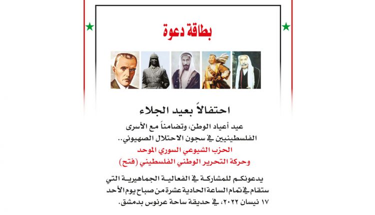 احتفالاً بعيد الجلاء، عيد أعياد الوطن، وتضامناً مع الأسرى الفلسطينيين في سجون الاحتلال الصهيوني..