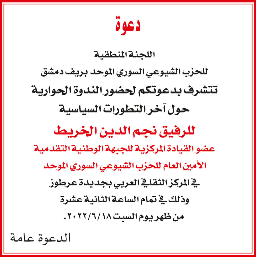 تتشرف بدعوتكم لحضور الندوة الحوارية حول آخر التطورات السياسية