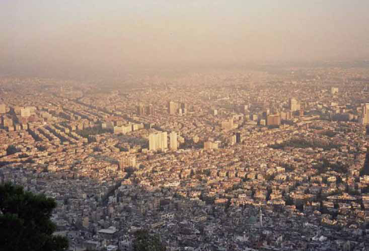 لا هواء نقيّاً في دمشق، والتوسع العمراني منفلت بجنون وغير مدروس، وهذا غالباً ما تكون تأثيراته كارثية على البيئة، وهناك أيضاً توسع في أسطول النقل العام، فهناك آلاف من السيارات، التي لا تراعي الشروط البيئية في صناعتها. وليس أسطول النقل الجماعي بقطاعيه العام والخاص، الذي يعمل على المازوت، أقل ضرراً، فهو بعيد كل البعد عن المعايير الفنية. وإضافة إلى وسائل النقل، هناك ملوث أخطر ولكنه خفي الى حد ما، إ تنتشر في المدينة معامل لصهر الرصاص، الناتج عن البطاريات المستعملة، تؤدي الانبعاثات الصادرة عنها إلى أضرار صحية خطيرة. كما تلعب كلٌّ من المعامل التي تفرز أبخرة وغازات سامة، وحركة البناء النشيطة جداً، والأسلحة المستخدمة في الحرب الدائرة في البلاد، دوراً هاماً في اختناق البيئة في عاصمة الياسمين.